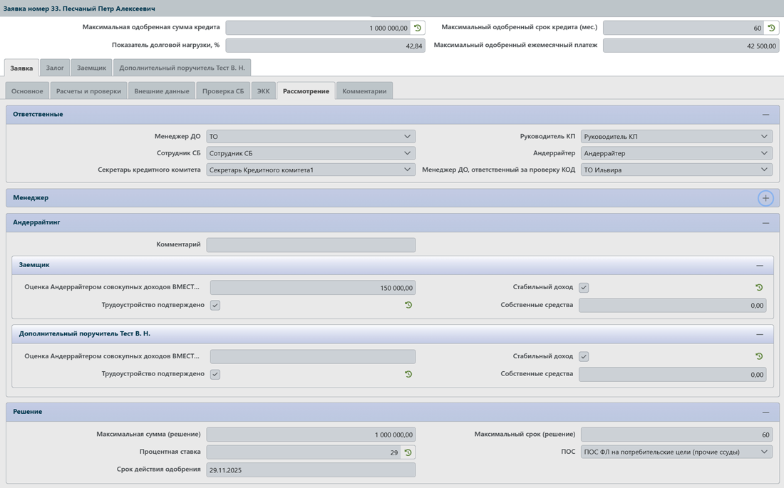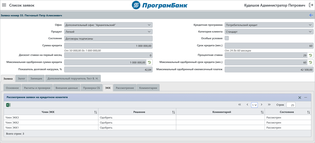 «ПрограмБанк.Кредитный Конвейер» рассчитывает необходимые показатели для принятия решения по заявке: скоринговый балл, показатель долговой нагрузки, максимально возможную сумму кредита и т.д.