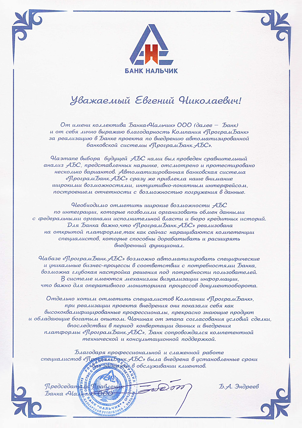 ![]() Отзыв от Банка «Нальчик» ООО о внедрении «ПрограмБанк.АБС» |