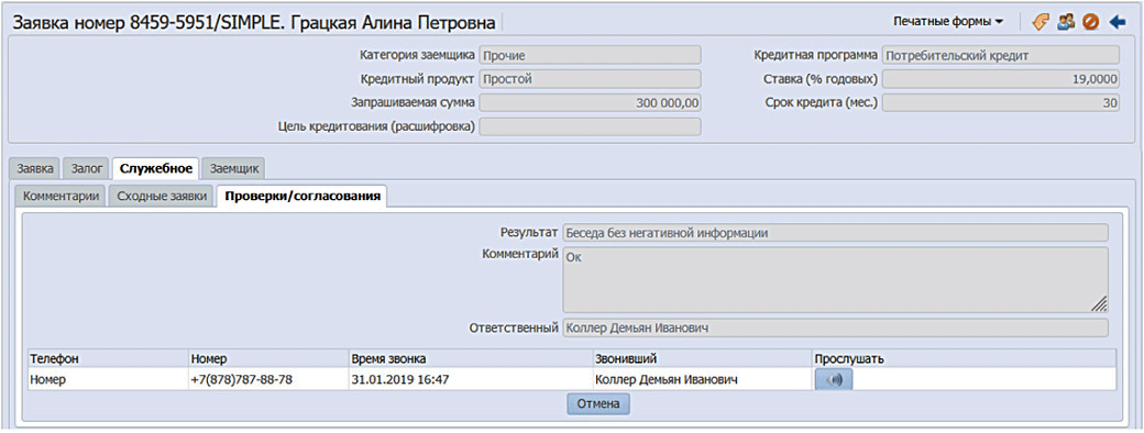 На всех этапах рассмотрения кредитной заявки может осуществляться необходимое взаимодействие с клиентом (электронные сообщения, телефонные переговоры). Верификация по телефону может применяться, например, для заявок, поданных online.