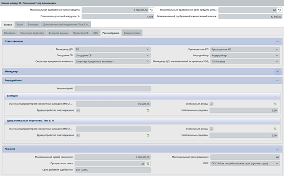 «ПрограмБанк.Кредитный Конвейер» рассчитывает необходимые показатели для принятия решения по заявке: скоринговый балл, показатель долговой нагрузки, максимально возможную сумму кредита и т.д.